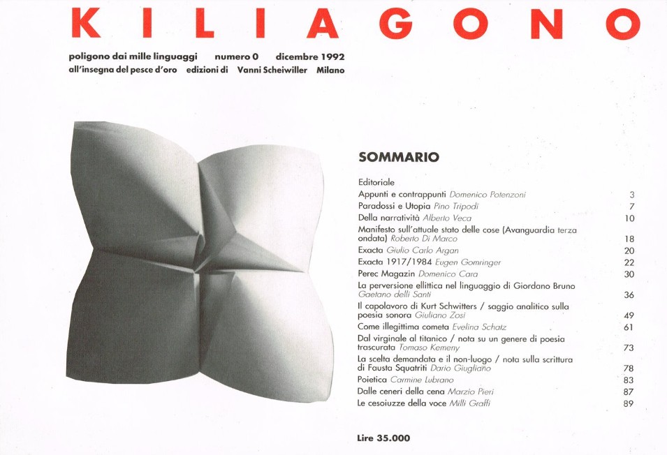 La rivista viene fondata a Milano da Gaetano Delli Santi e Fausta Squatriti per dare voce al gruppo DEE ZEE BEEE, costituitosi nel maggio 1992 nel capoluogo lombardo con l’obiettivo di condurre una ricerca interdisciplinare. «Regola del gruppo» ‒ si legge nell’Editoriale del numero 0 ‒, la cui denominazione è desunta dall’ultimo verso dell’Ursonate di Kurt Schwitters, «è la volontà di rottura del cerchio chiuso delle specializzazioni culturali che non permettono più di distinguere tra artista imprenditore e artista ricercatore» (p. 1), in favore di una ricerca intermediale, sempre aperta, plurale e progettuale. Alla compagine, formata da Gaetano Delli Santi, Fausta Squatriti, Arrigo Lora-Totino, Giuliano Zosi e Marcello Aitani, si uniscono nella redazione di «Kiliagono» Dario Giugliano, Getulio Alviani, Giulio Carlo Argan, Claudio Boncompagni, Domenico Cara, Roberto Di Marco, Carmine Lubrano, Domenico Potenzoni, Maria Grazia Torri e Pino Tripodi. Della rivista escono soltanto due numeri, lo 0 e l’1/2, rispettivamente del 1992 e del 1995, ma si rilevano alcuni contributi di particolare interesse come Manifesto sull’attuale stato delle cose (Avanguardia Terza Ondata) di Roberto Di Marco, Exacta 1917/1984 di Eugen Gomringer, Il capolavoro di Kurt Schwitters. Saggio analitico sulla poesia sonora di Giuliano Zosi, La curva e il doppio di Stelio Maria Martini e Quando l’eterogeneità fa testo di Stefano Colangelo con interventi di Bettini, Carlino, Delli Santi, Giugliano, Mastropasqua, Muzzioli, Patrizi, Pignotti, Sanguineti e Squatriti. Nel numero 0 sono presenti Come illegittima cometa di Evelina Schatz e Le cesoiuzze della voce di Milli Graffi, mentre nel numero 1/2 si segnalano Il tradurre e l’assurdo di Lina Angioletti, Paesaggio d’Oriente e d’Occidente di Marosia Castaldi e Racconto aperto di Maria Grazia Torri.
